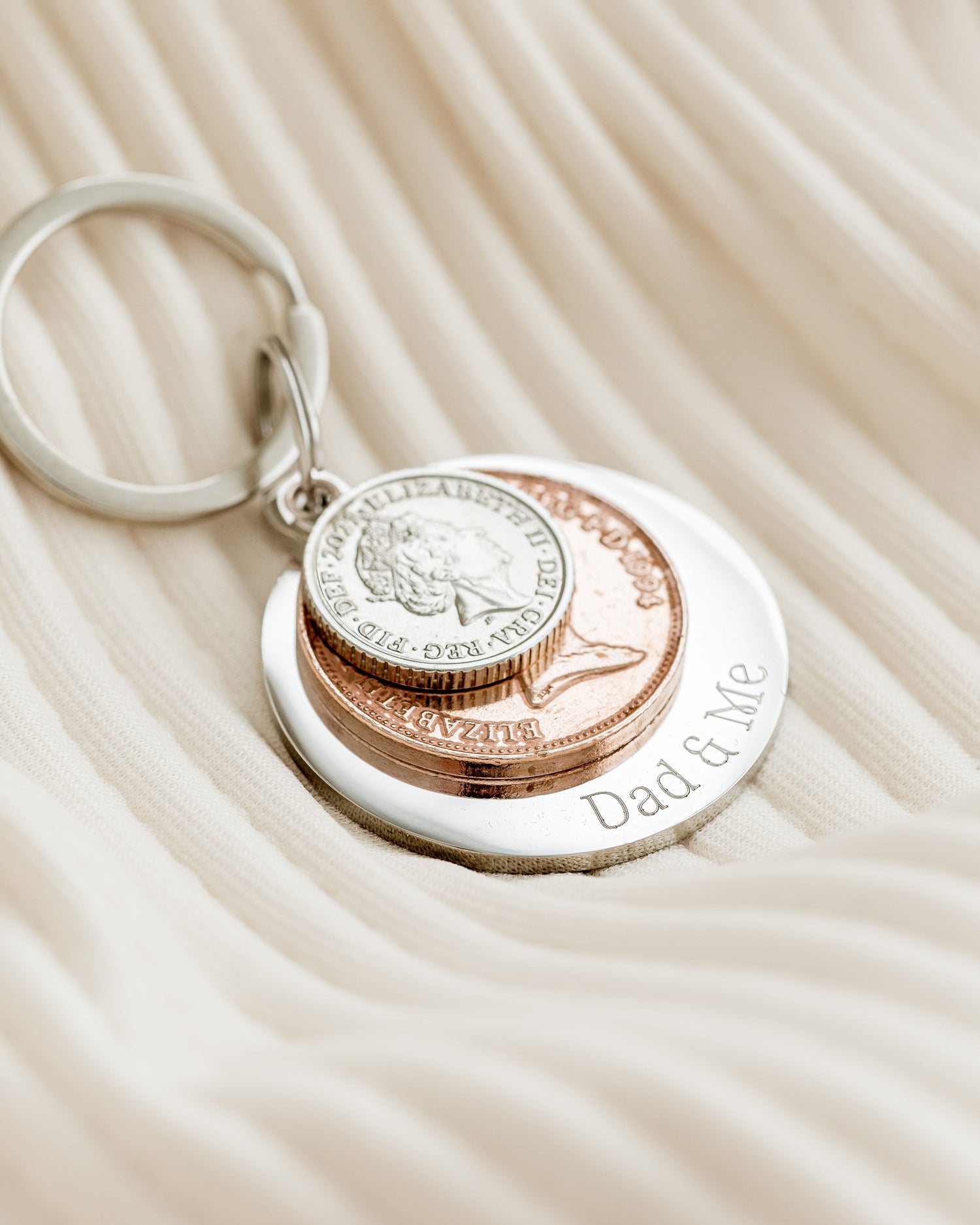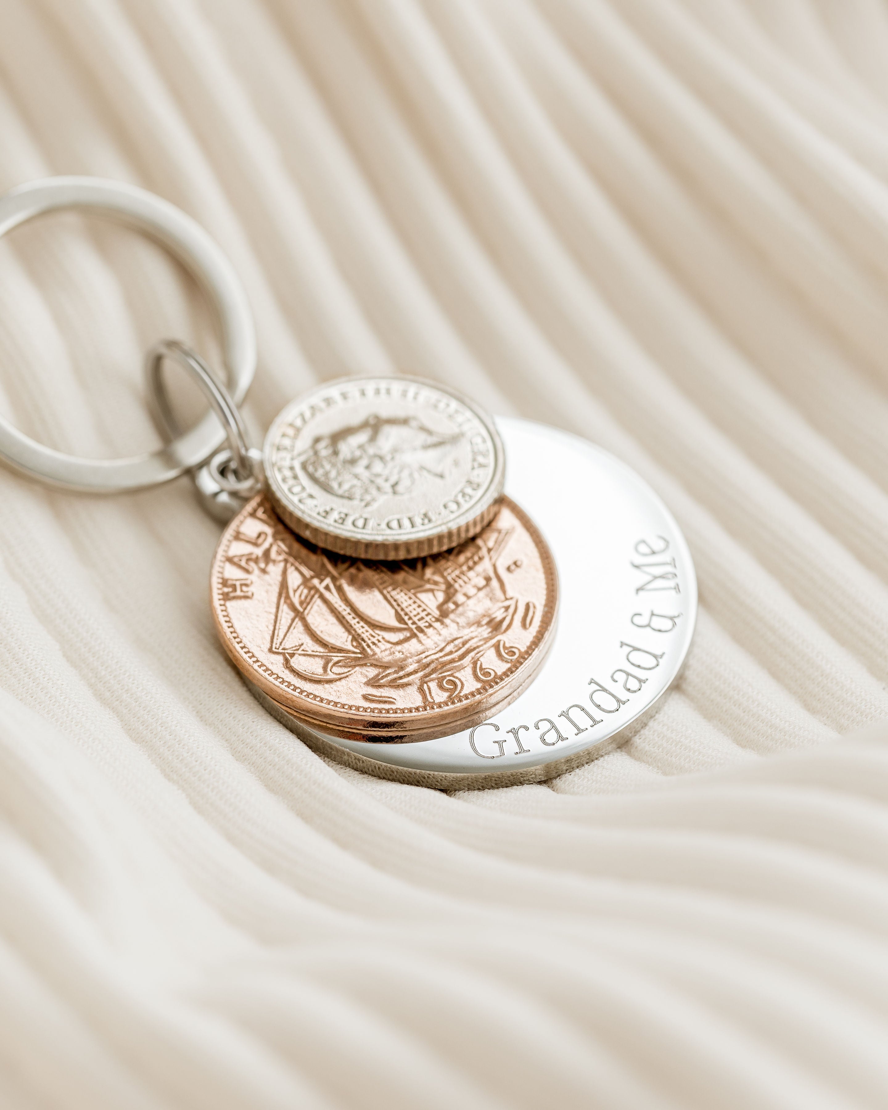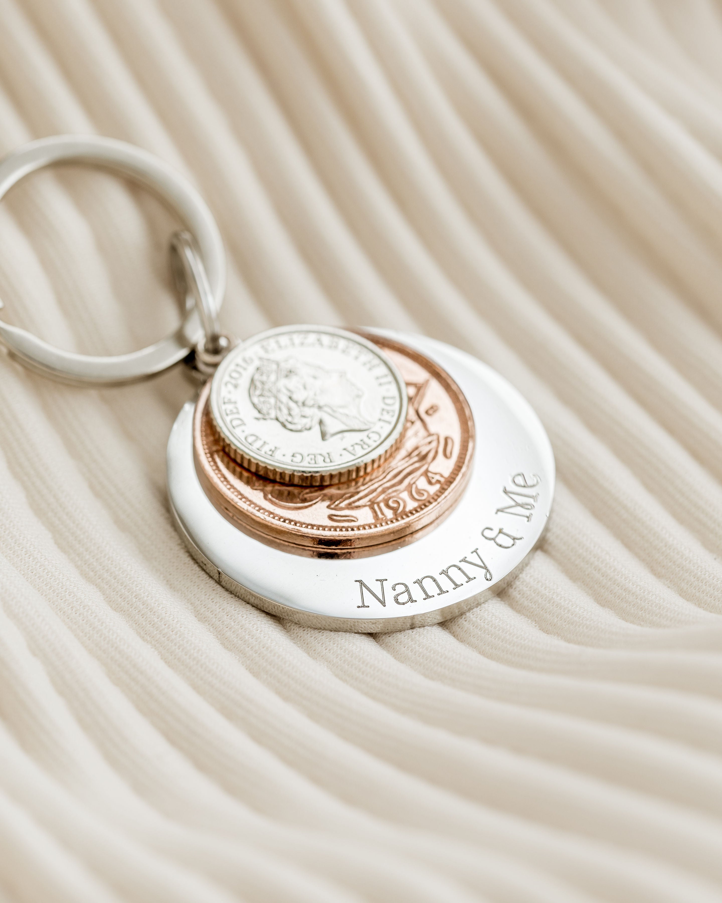 They’re personalised keyrings made from real coins, each one carefully chosen to represent a year that holds meaning — often a birth year, but it can be any year that’s important to you. The coins are finished with a sterling silver loop and paired with an engraved disc where you can add up to 25 characters of your own wording — a name, a date, a short message, whatever feels right.