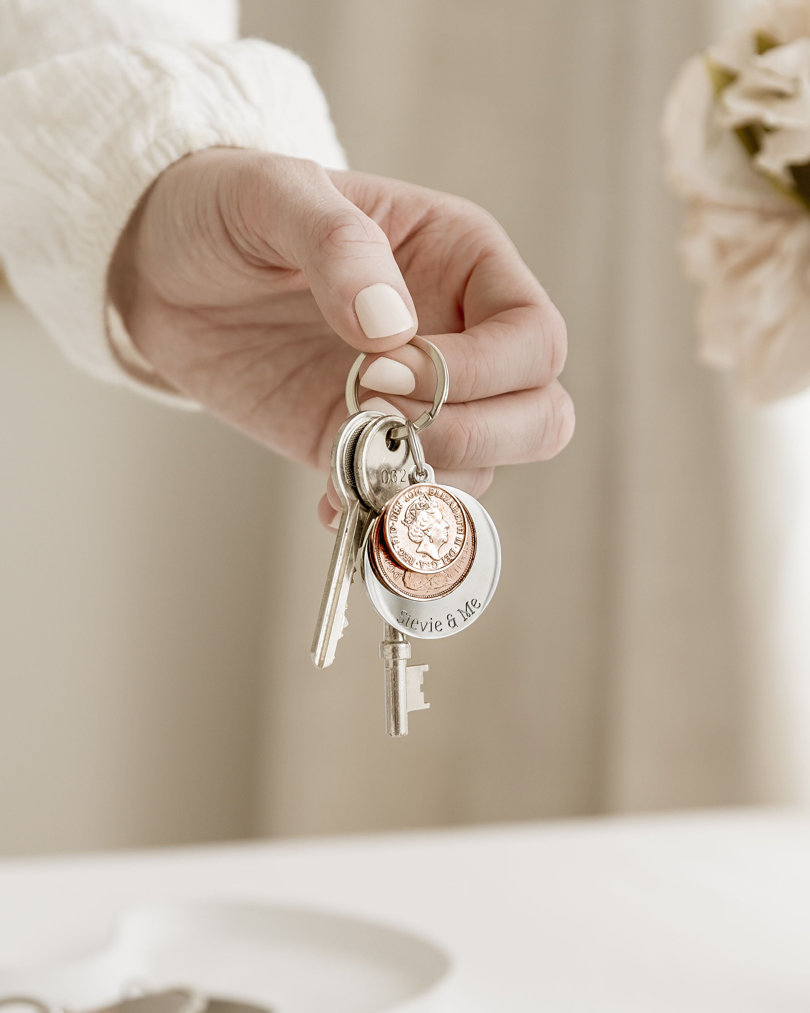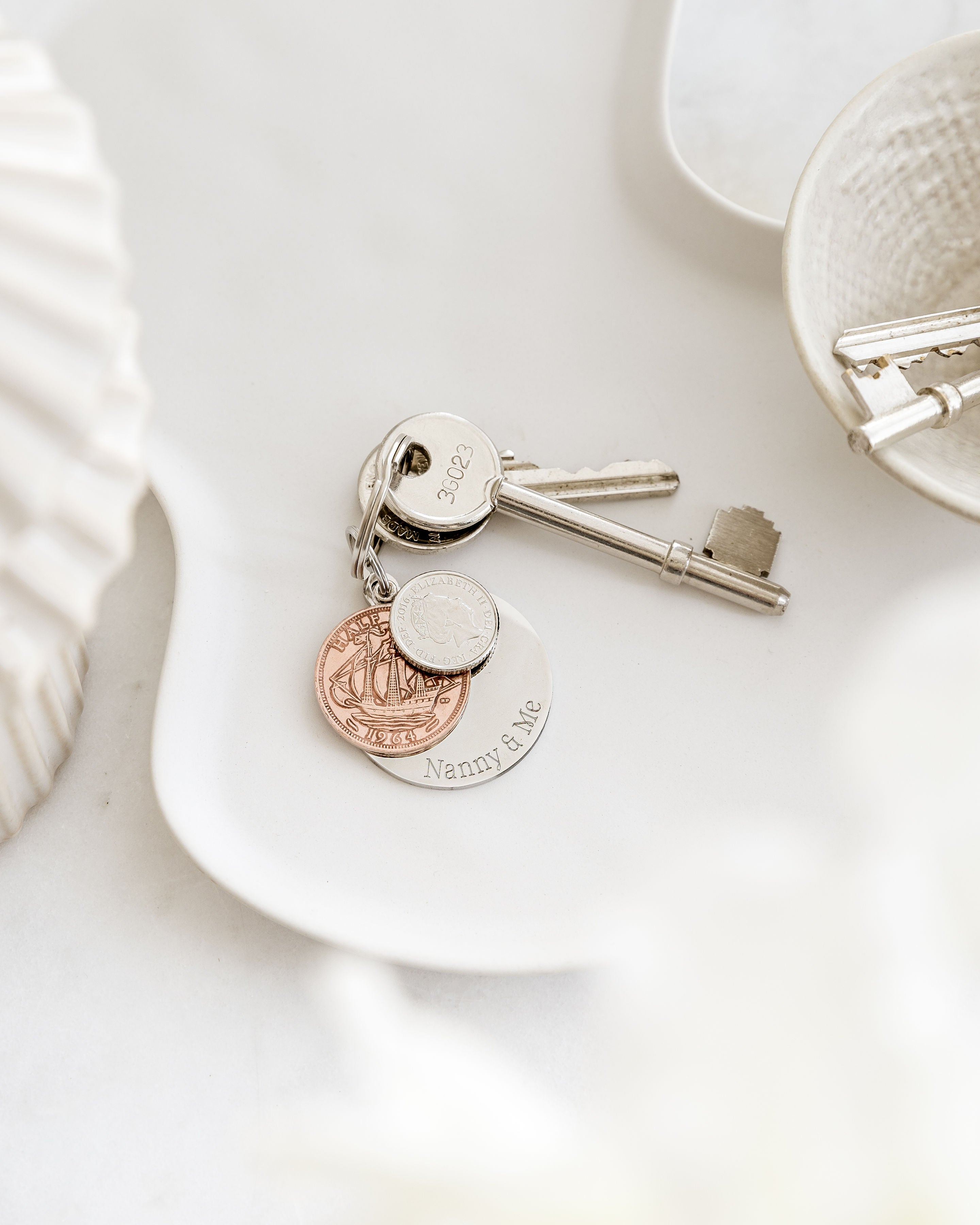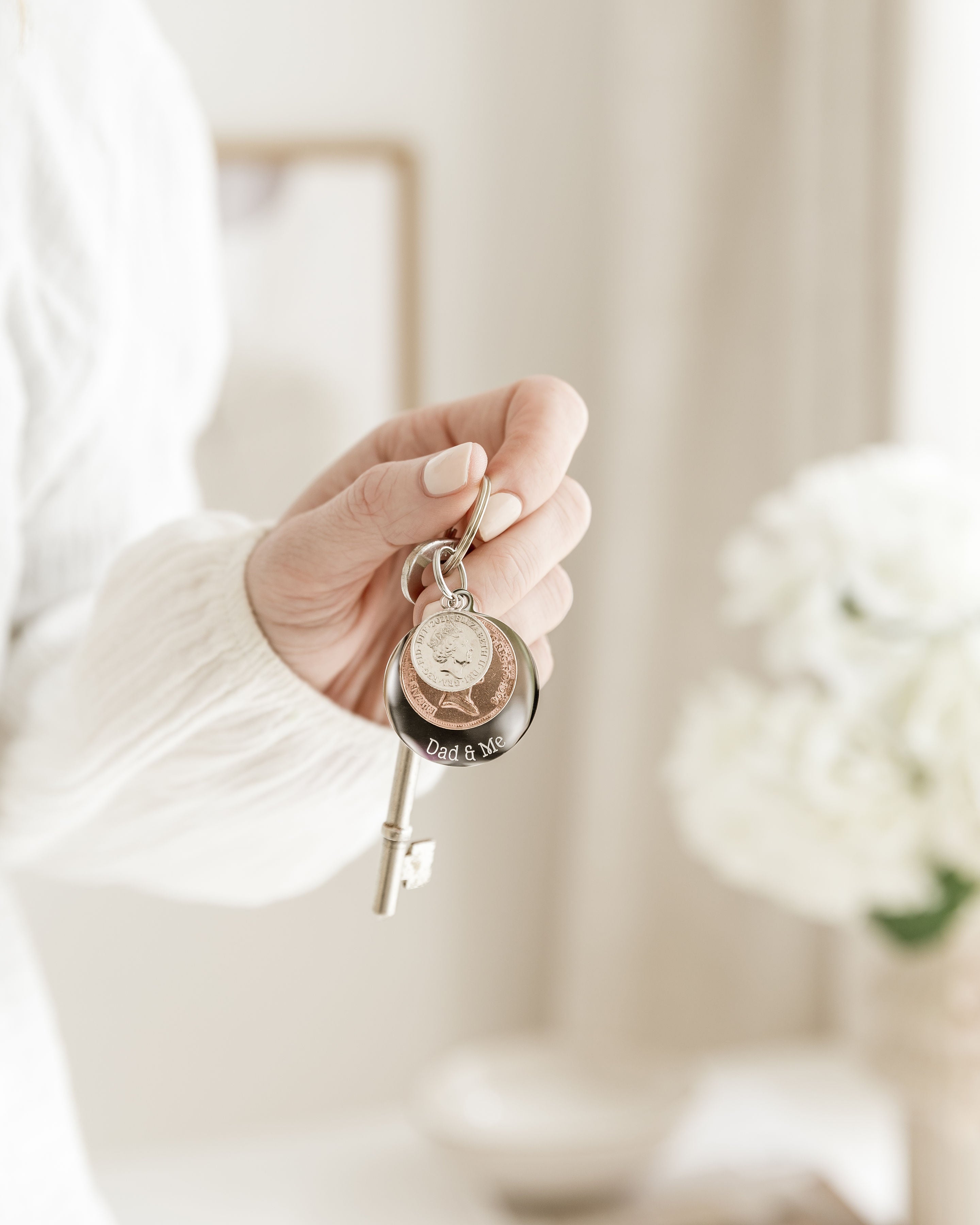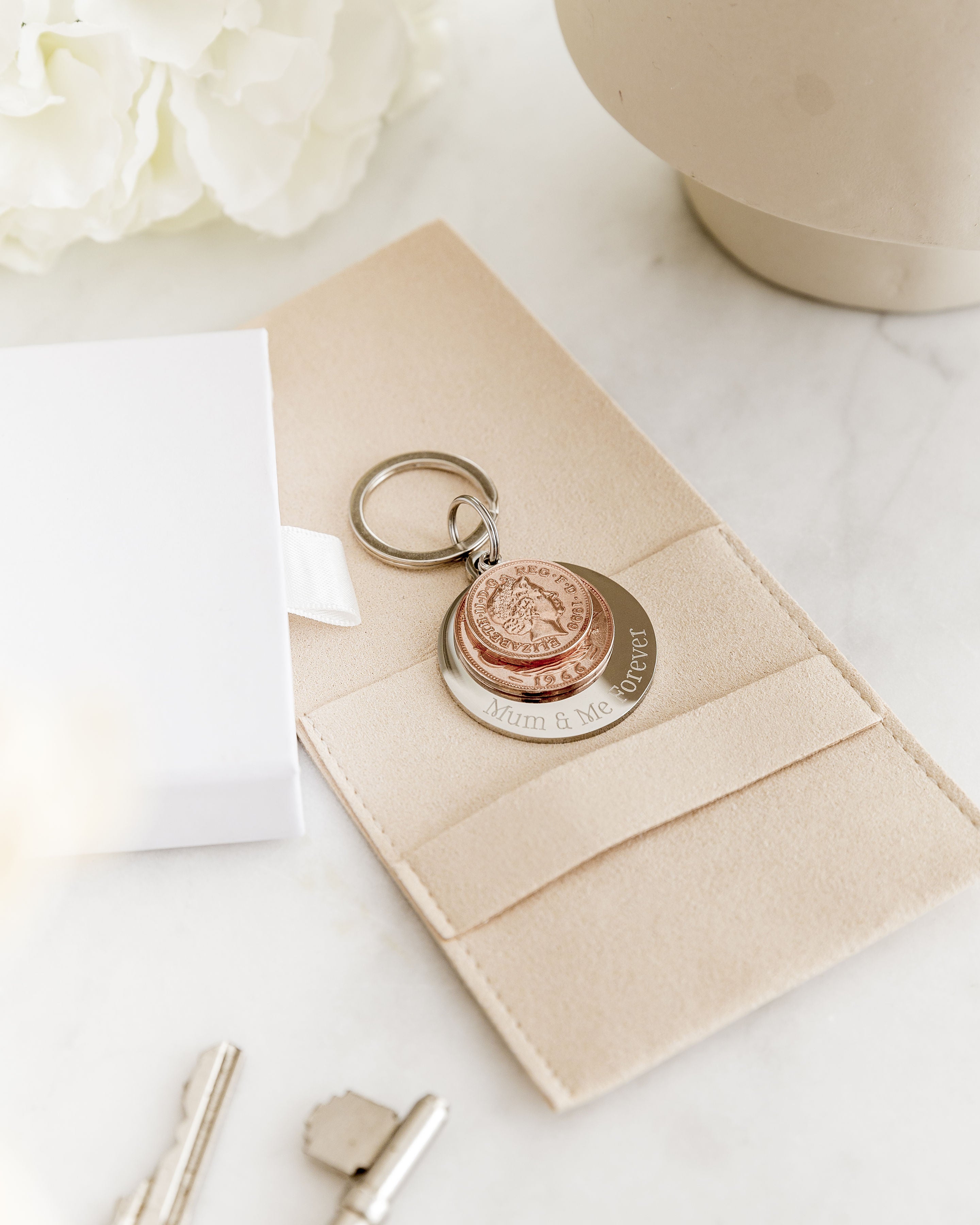 They’re personalised keyrings made from real coins, each one carefully chosen to represent a year that holds meaning — often a birth year, but it can be any year that’s important to you. The coins are finished with a sterling silver loop and paired with an engraved disc where you can add up to 25 characters of your own wording — a name, a date, a short message, whatever feels right.
